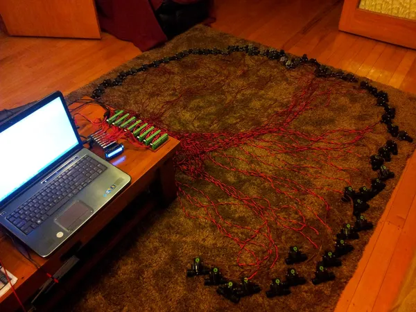 Last weekend the Luxcity event went down in Christchurch, NZ. The Tonic control system was brought down and the whole system was set up on Saturday. Unfortunately, some problems were encountered during the set-up, namely the sagging of the tensioned structure (the dimensions weren’t quite right, and when the crane pulled the structure up, it didn’t come together correctly). The manifold system also started leaking from every possible connection (and with 58 sets of couplings, reducers, splitters, and solenoids, there were 100’s of leaks :-0).