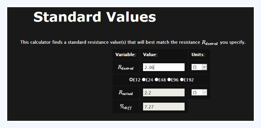 There is a new calculator on the Resistors page, called the Standard Resistance Calculator. You pass it any resistance, and it will find the closest standard resistance according the series you specify (e.g. E12, E48 series).