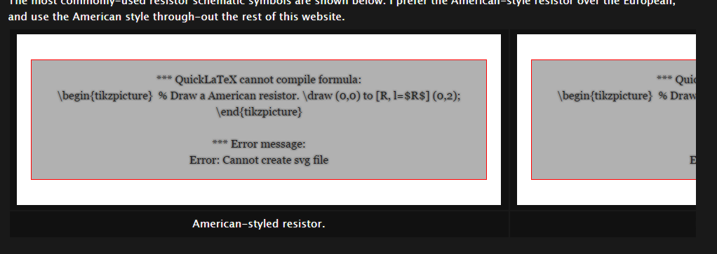 - The resistor symbols on the Resistors page are not being rendered. The error messages given are: “QuickLatex cannot compile formula…” and “Error: cannot create svg file.”. I think this might have something to do with me switching back to using the Visual editor rather than the raw text error.