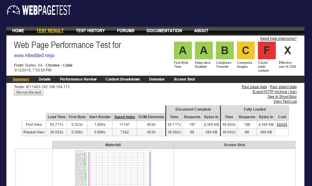 I also ran the website through www.webpagetest.org. Here is a summary of the results: