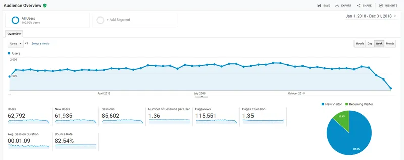 This is the first year I have used Google Analytics to gather these statistics. Even though I have been using Google Analytics for many years, in previous years I just relied on the statistics presented in the Wordpress admin dashboard. This is no longer possible as I am now using Hugo to power this site. This also means that the reported numbers are different, in fact, Wordpress seemed to always report higher numbers than Google Analytics. The stats for 2017 on this page are also from Google Analytics so that a fair comparison can be made. See the Happy New Year 2018 post for the Wordpress sourced 2017 stats.