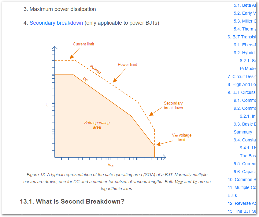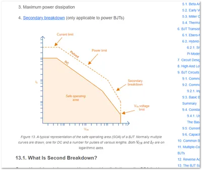 Added a safe operating area (SOA) graph to the BJT page, and added information on secondary breakdown.