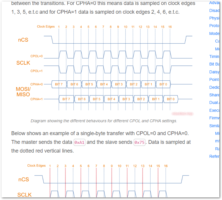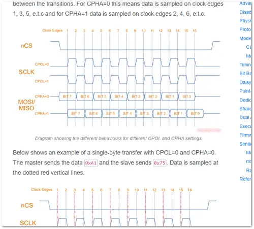 Added info and diagrams on SPI CPOL and CPHA settings, incl. example byte transfers.