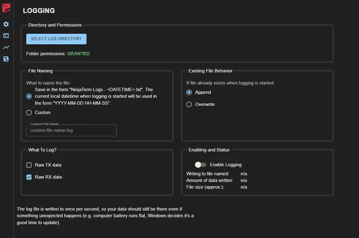 Last serial port details and connection state are remembered across App reloads, and NinjaTerm can automatically reconnect to previously used serial port.
