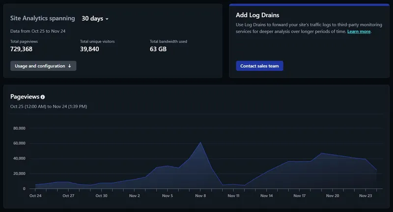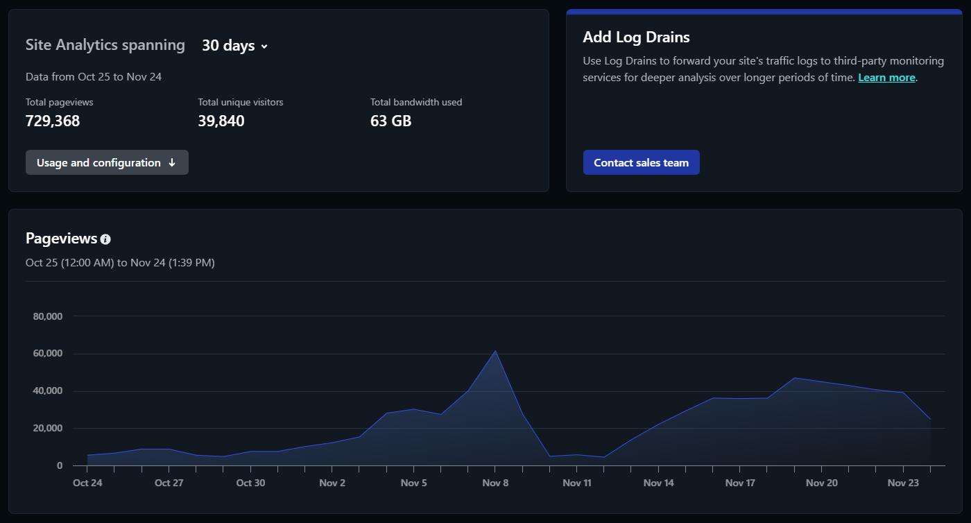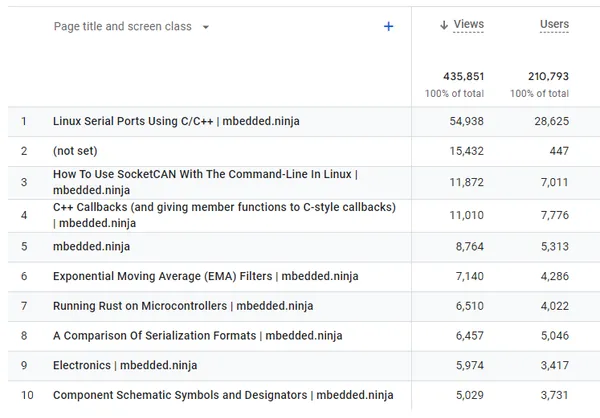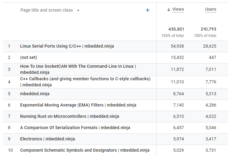 I discovered that many ad blockers also block Google Analytics, so this figure is likely less than the true value, given many people visiting this site will be software/electrical engineers who will use ad blockers. In an attempt to get a more realistic number, I paid for a month of Netlify’s analytics service which can’t be blocked in the same way as it’s working on the server side when requests are made (I use Netlify to host this blog). Netlify reported 729k visitors in just 1 month!?! Is this is to be believed that is approx. 8.7M visitors a year. This seems too high, so maybe it’s also recording a lot of bots? The true value might be someone between the two?