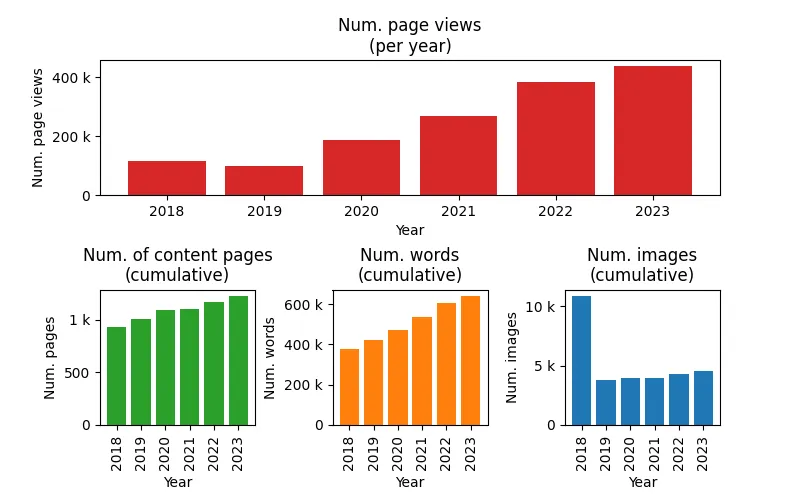 At the end of 2023 the site had 639k words, up from 604k words last year (an increase of 35k). These words were spread over 1221 pages, and included 4,518 images (an increase of 199 from 4,319 images last year).