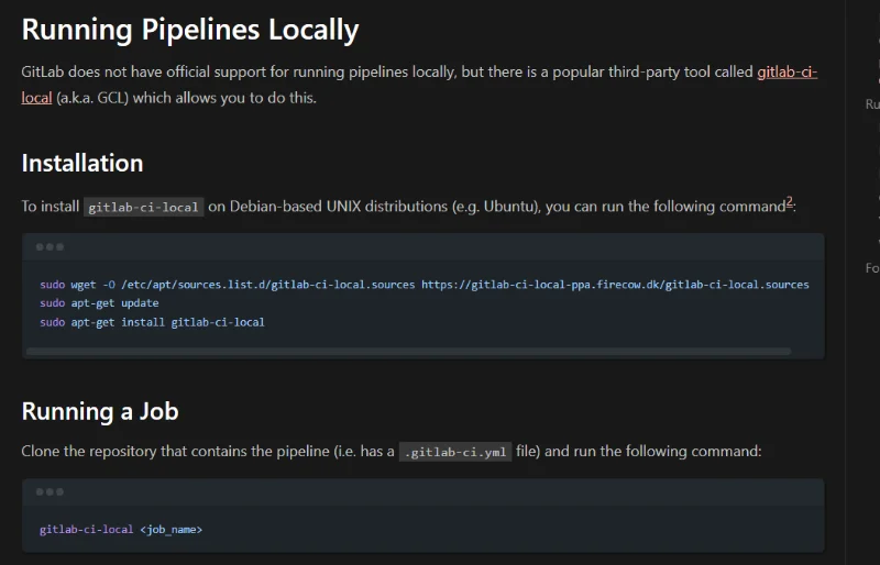 Added information on how to run GitLab pipelines locally using the gitlab-ci-local tool.