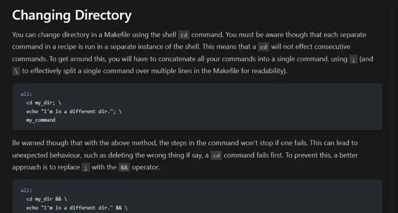 Added information on changing directory and detecting the operating system in a Makefile.
