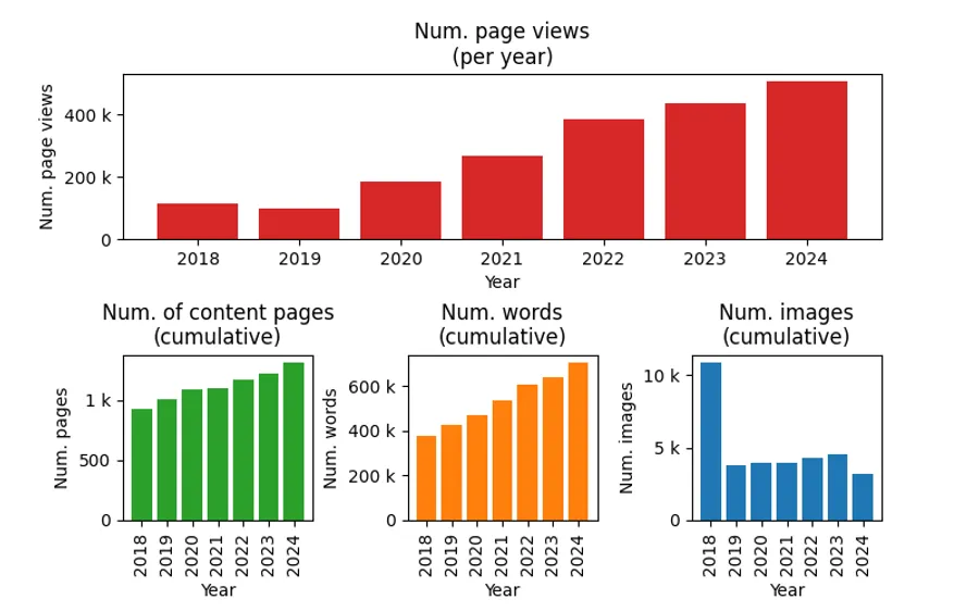 At the end of 2024 the site had 704k words, up from 639k words last year (an increase of 65k). These words were spread over 1313 pages (up from 1221 pages last year), and included 3,222 images (an decrease of 1,296 from 4,518 images images last year). Even though many new images were added last year, the total dropped because I purged all of the redundant images that were still hanging around in the public/ directory from when the site was migrated away from Wordpress.