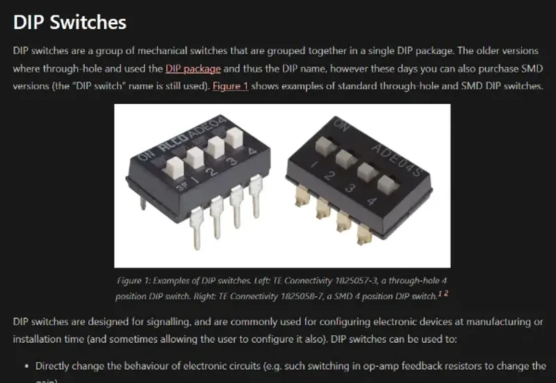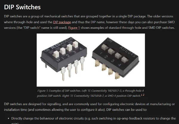 Added info on DIP switches including uses, photos and rotary DIP switches.